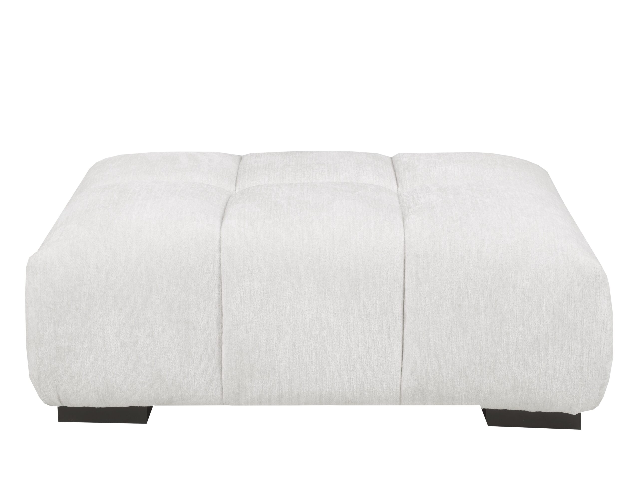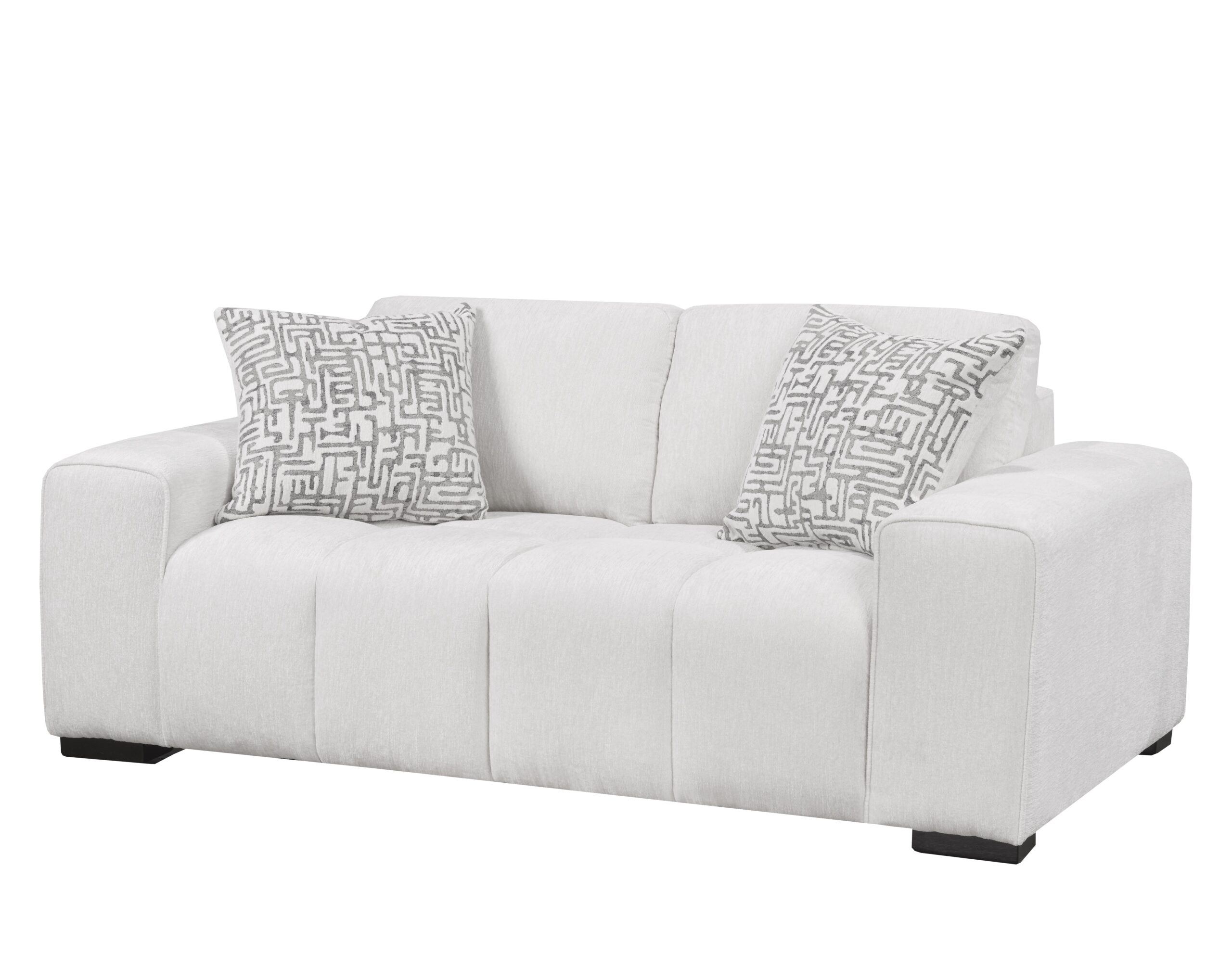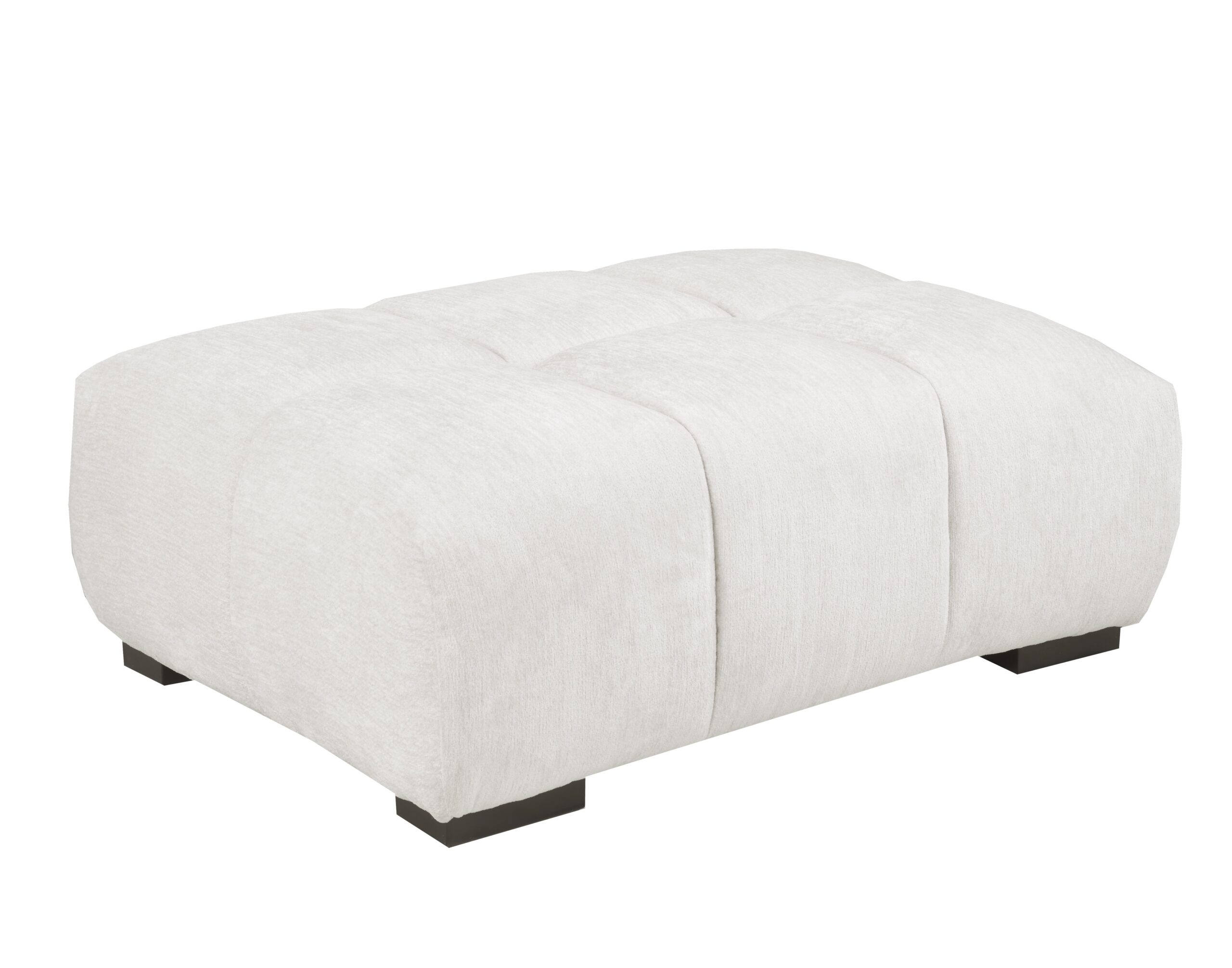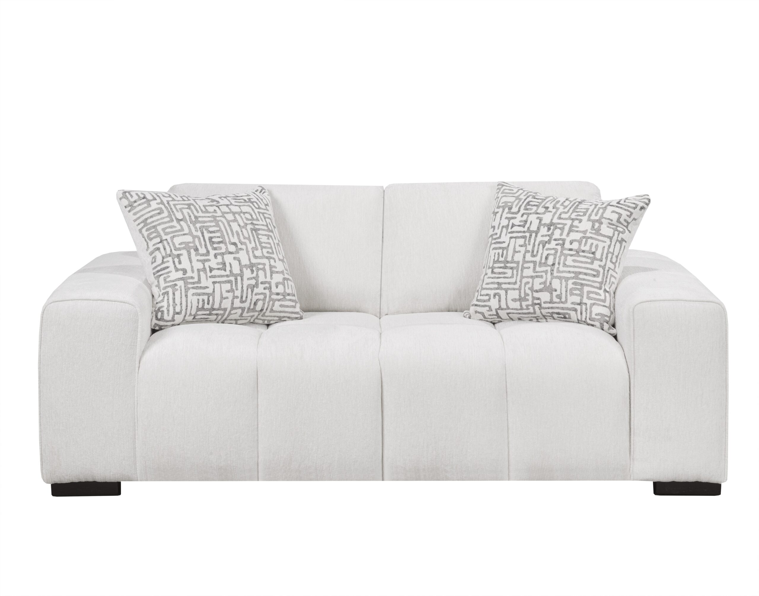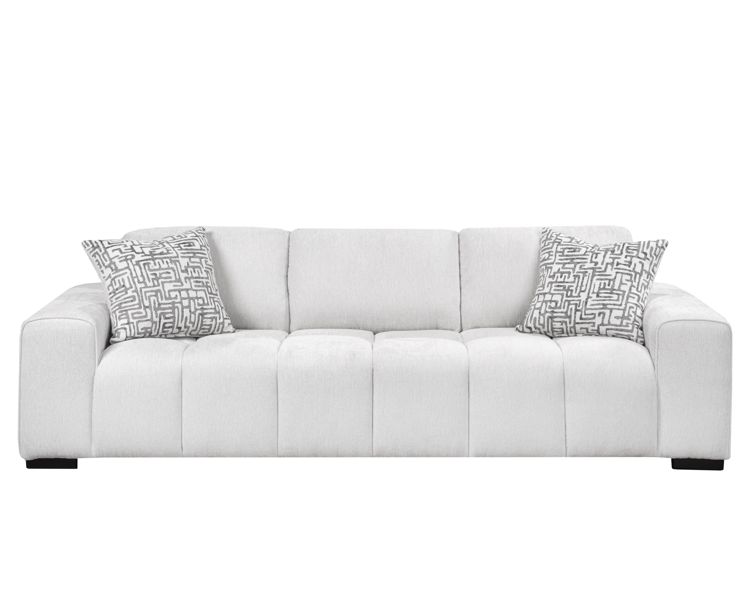 This modern living room set features a large sofa with thick, track arms and a channeled design all in a soft, cream fabric. A smaller 88″ sofa is also available for purchase.