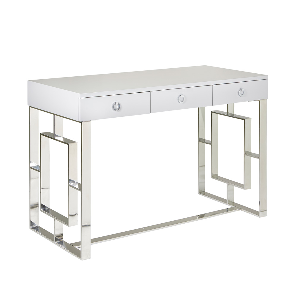 This desk features a white, high gloss lacquer top with three drawers and a modern, stainless steel frame. Great for any space!