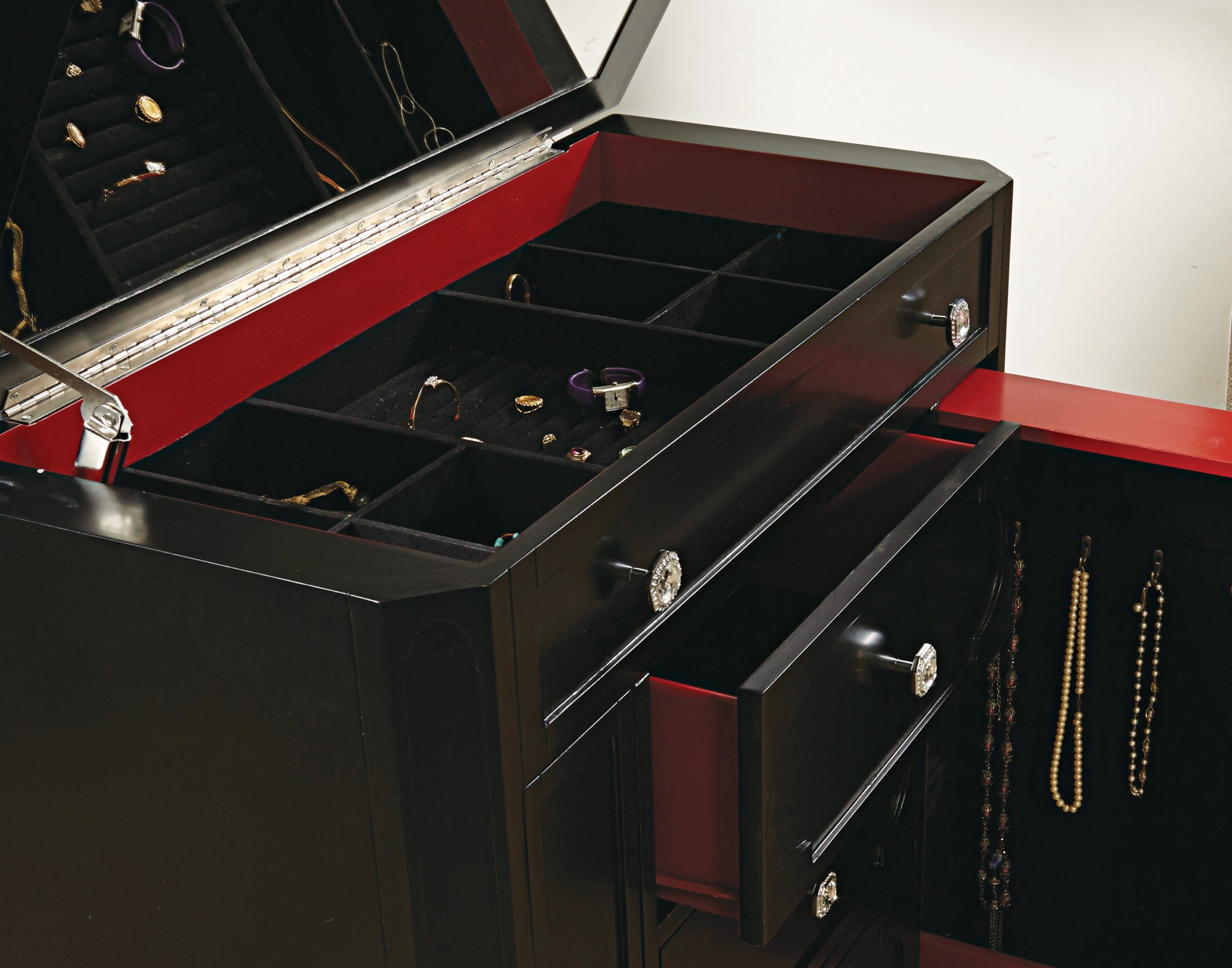 This contemporary jewelry chest offers a sleek and elegant design while providing a large amount of functionality. A mirror and jewelry tray can be found under the lift-top, three drawers run down the center and two pull-outs with necklace hangers flank each side. The rich black tone lets the platinum color of the hardware and trim sparkle and also accentuates the interior red color as well.