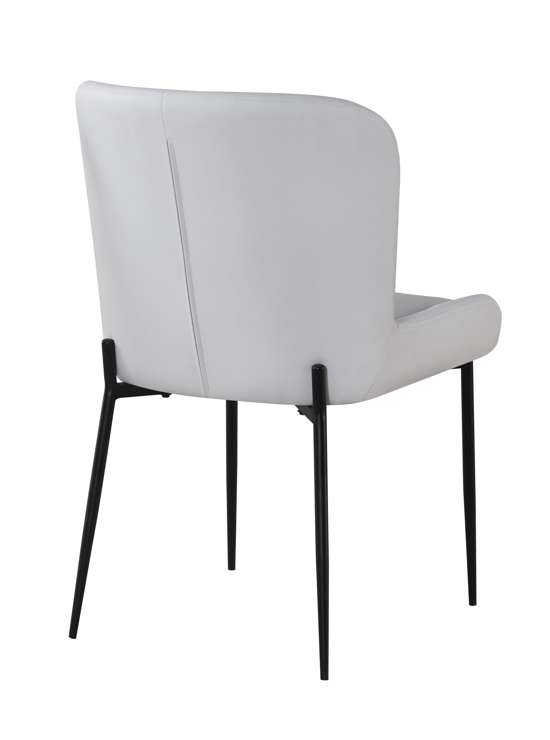 This sleek, contemporary dining chair features a curved back, a white leather look and black metal legs.