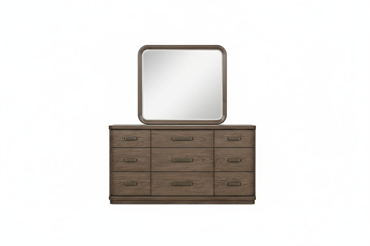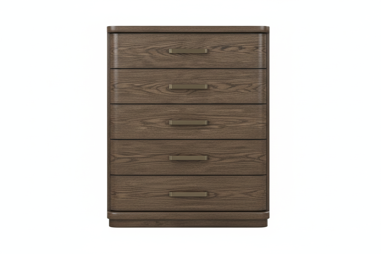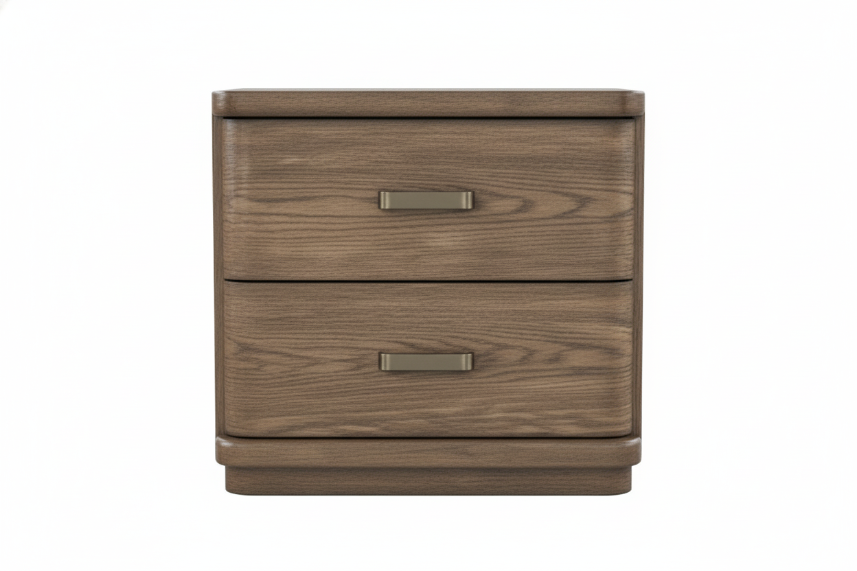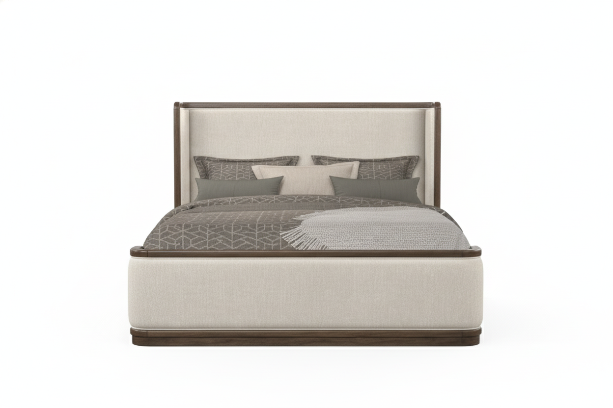 A fantastic bedroom that features an upholstered bed with a beautifully-tailored ivory fabric, curved corners and a brown wood stain. The headboard is upholstered not only on the inside, but on the exposed outside as well while the handles are burnished and curved to complete a chic, fashionable look.