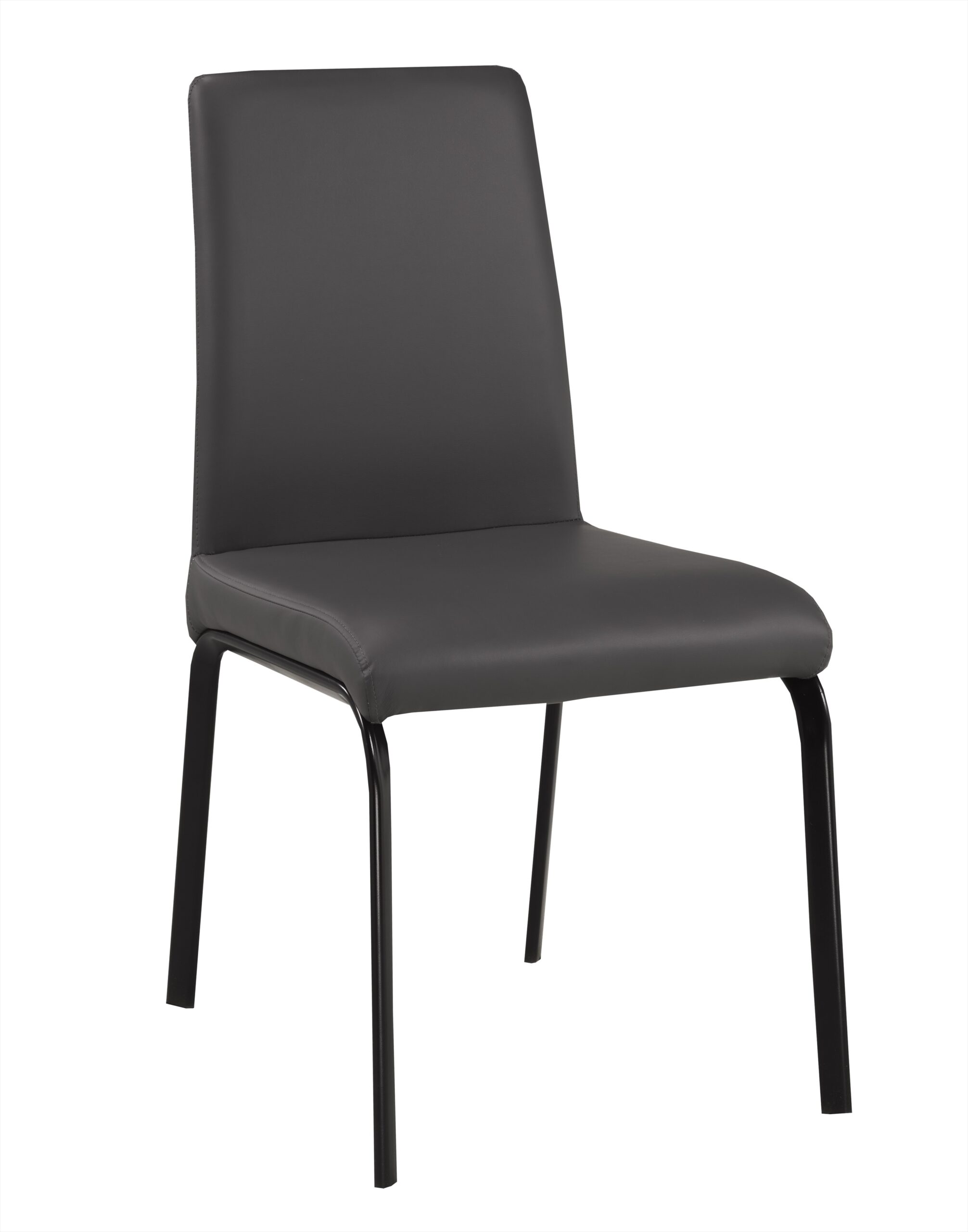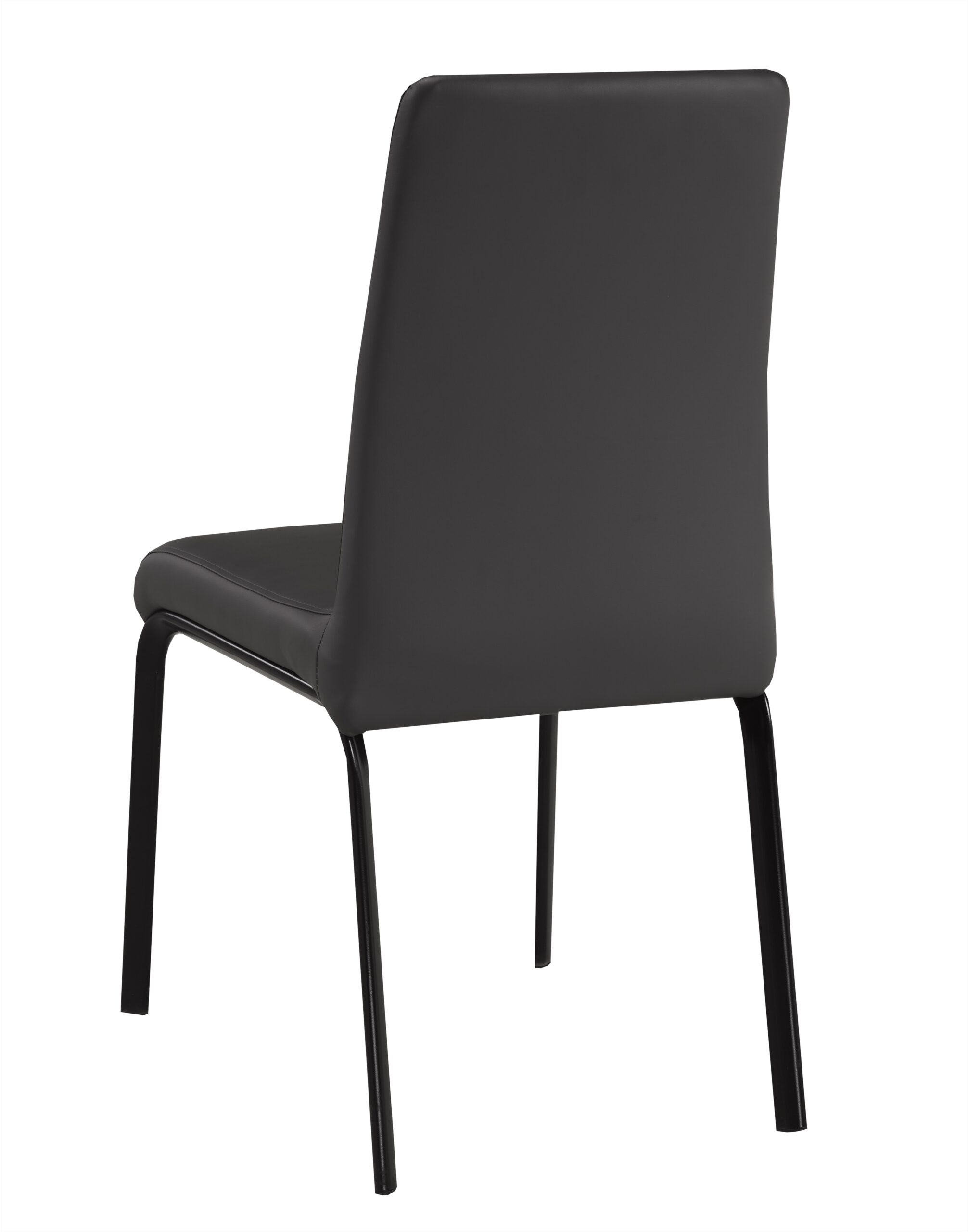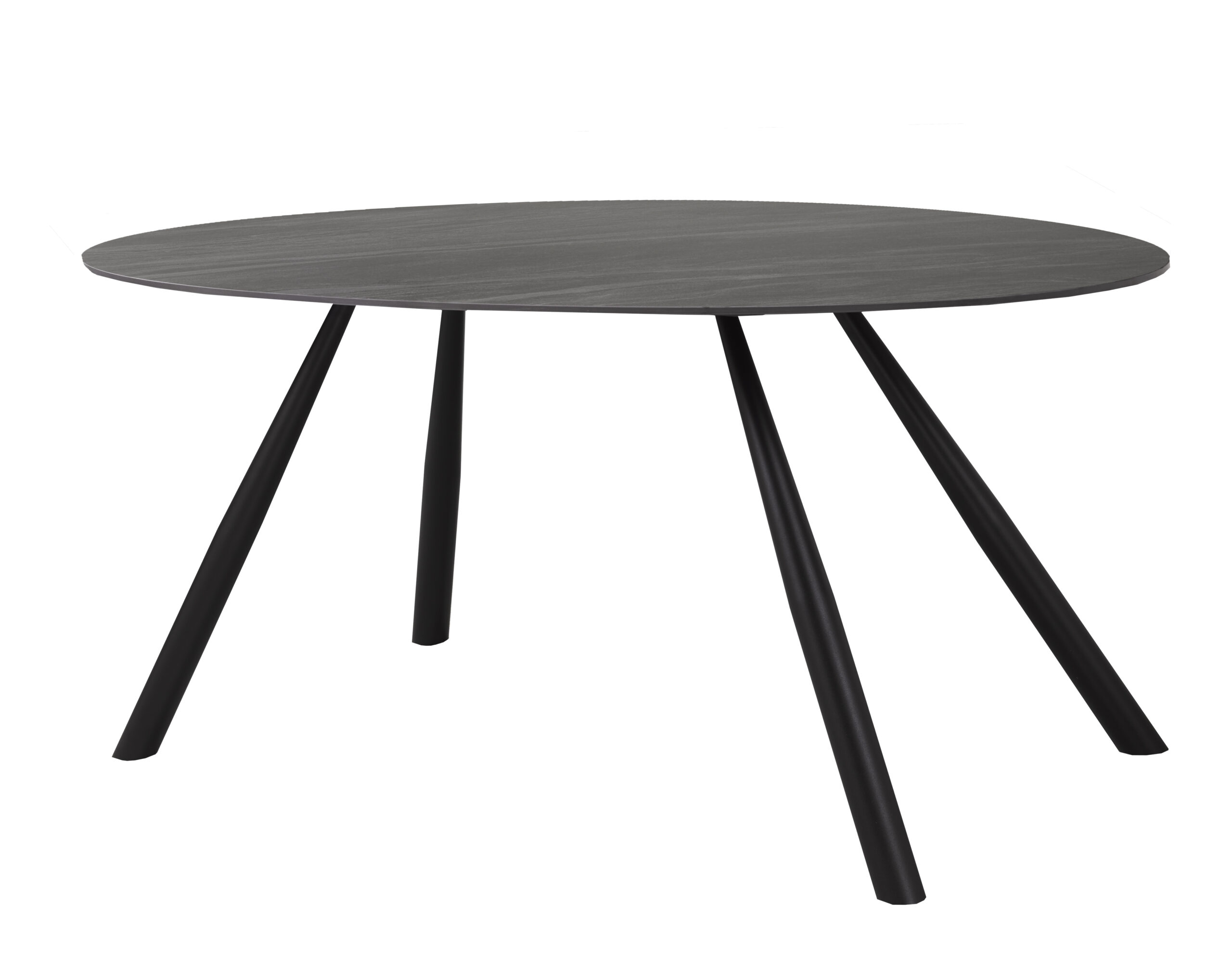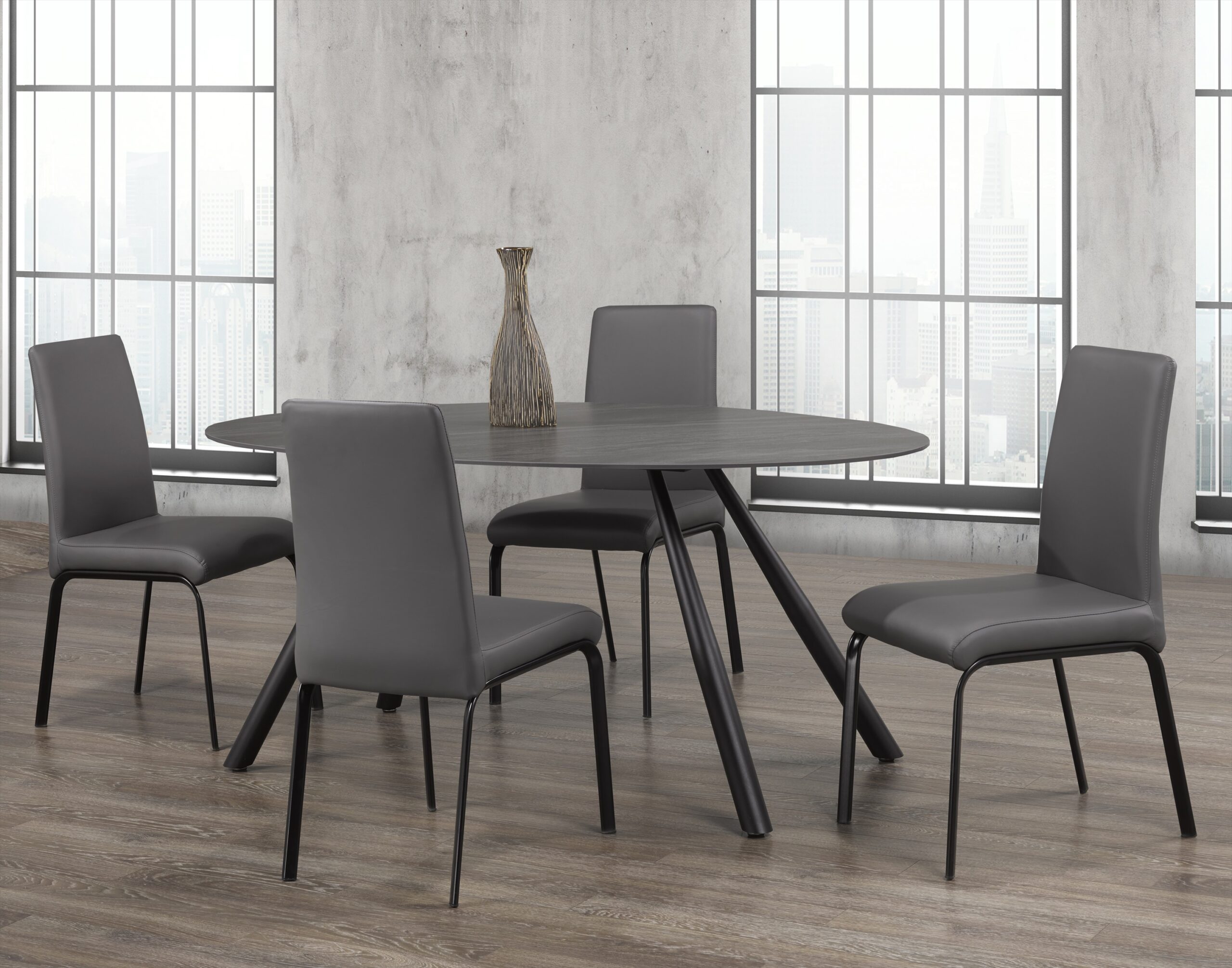 This dining set features an oval, durable, dark grey sintered stone table top and black metal legs. The chairs are designed with a tall back, a grey, faux leather look and black, metal legs as well.