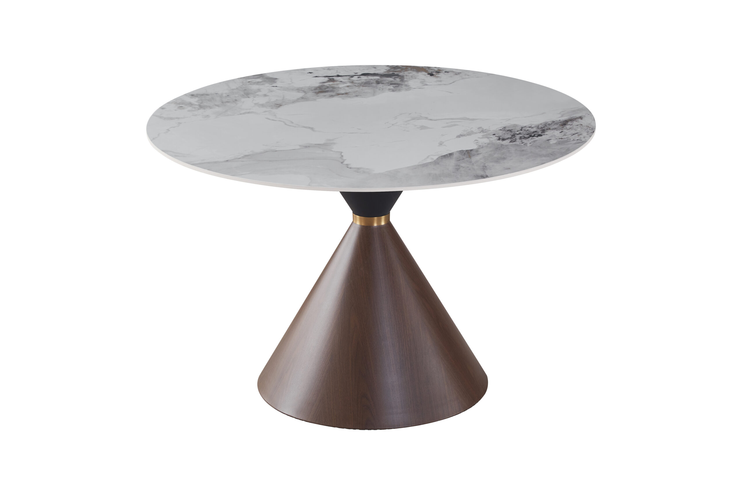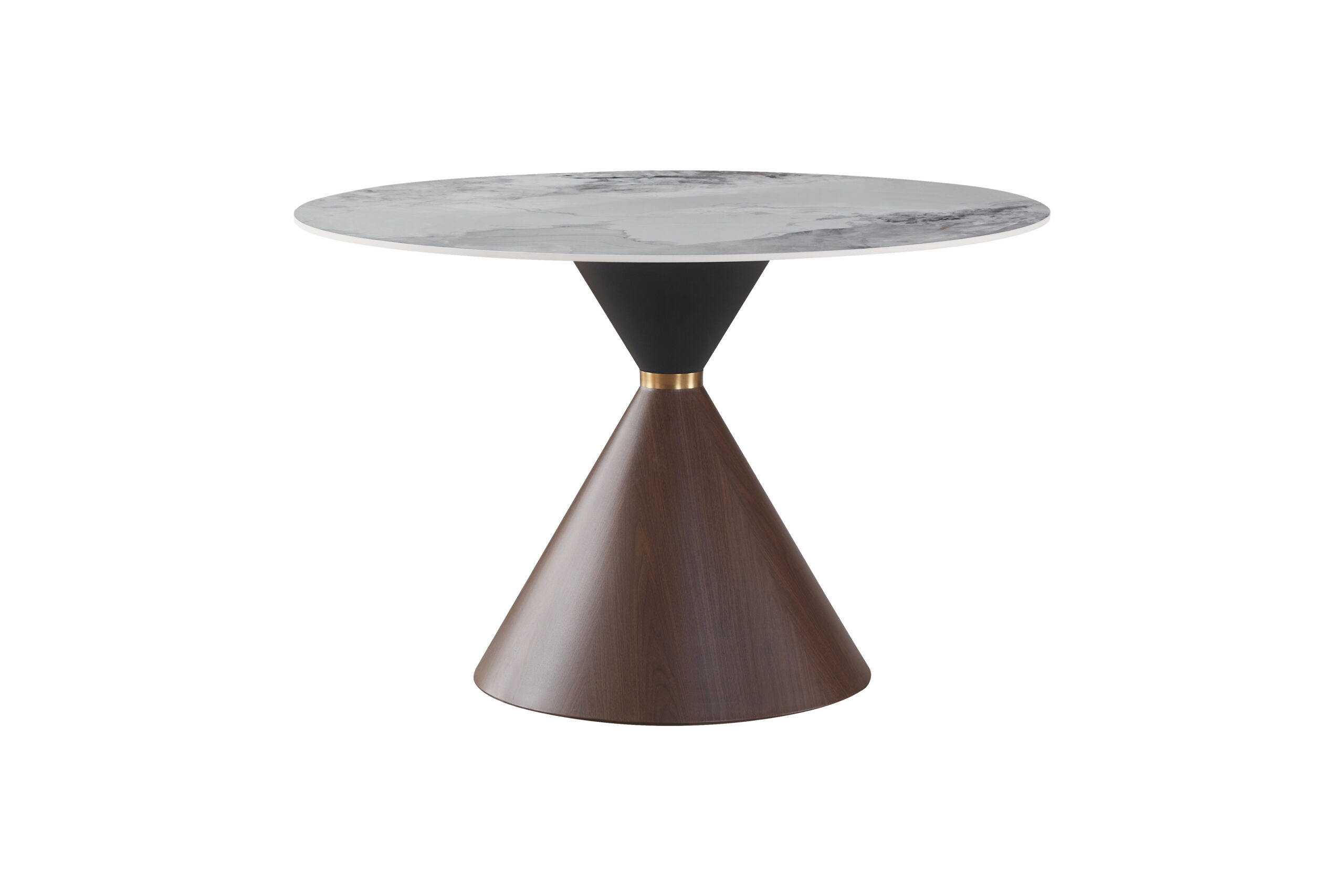 This amazing, chic dining room set combines art with function and features a sintered stone table top and an hourglass, metal pedestal base in a brown finish with black and gold accents. The chairs feature a sleek profile with a grey leather look and black metal bases.