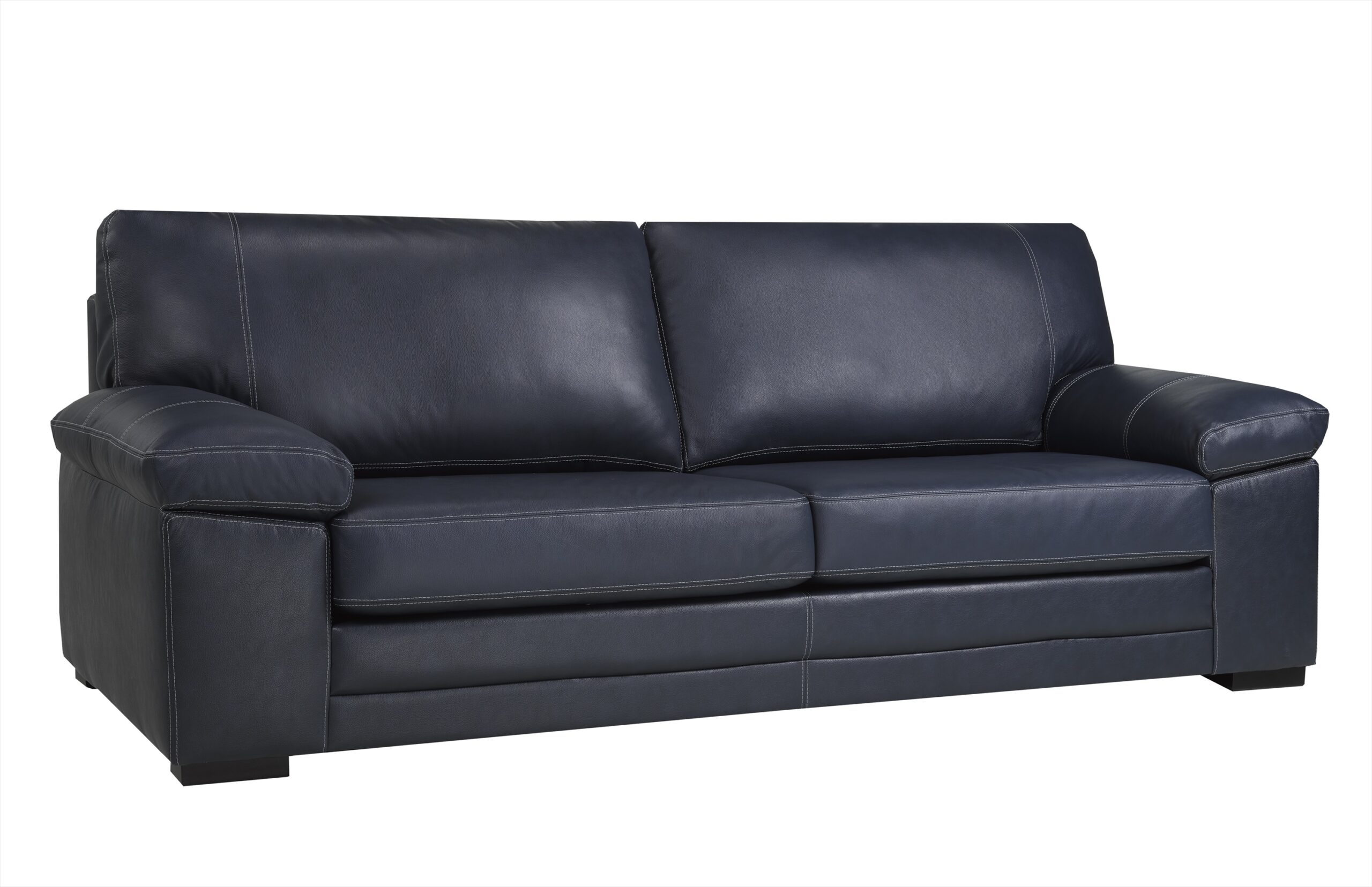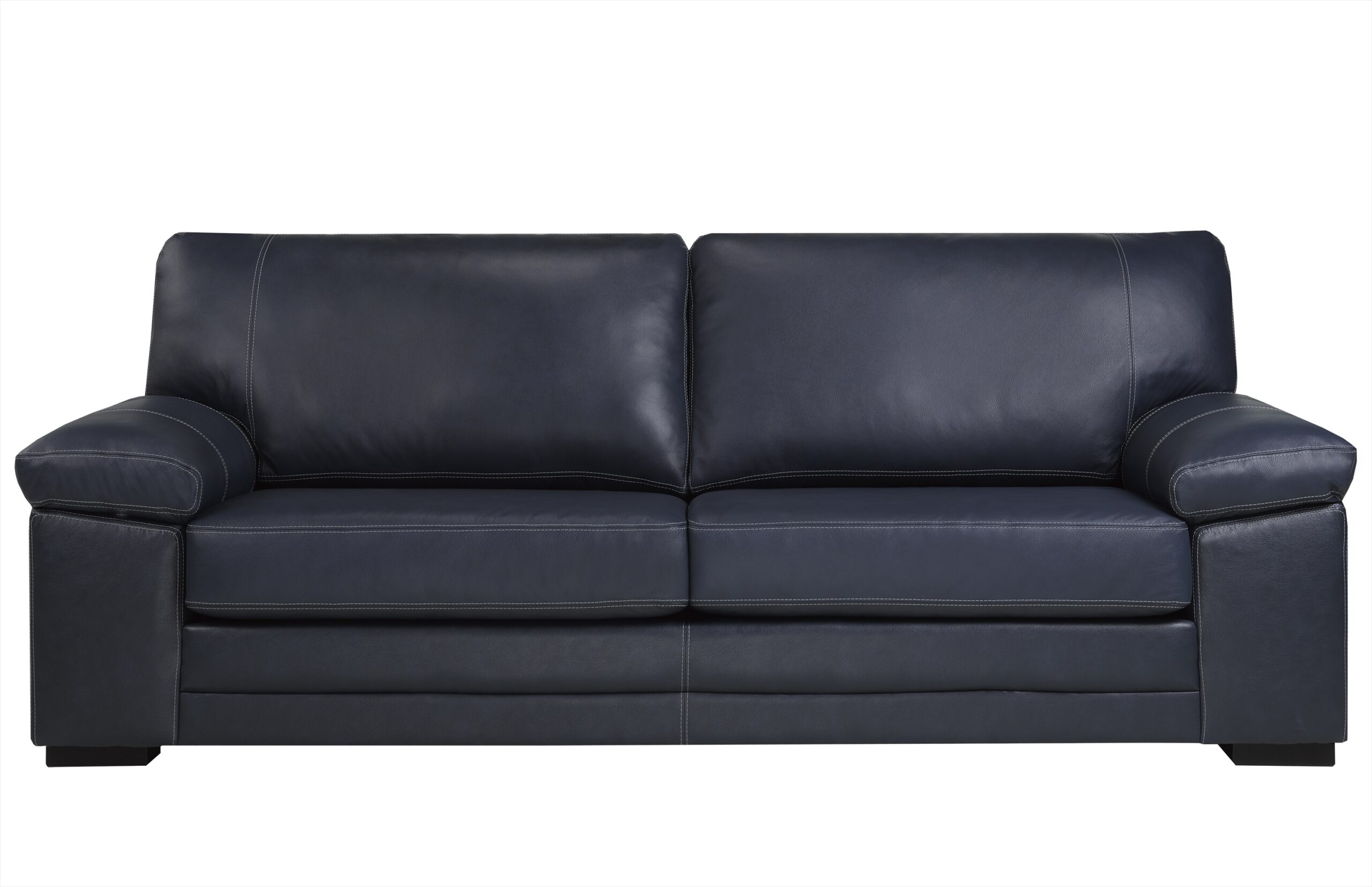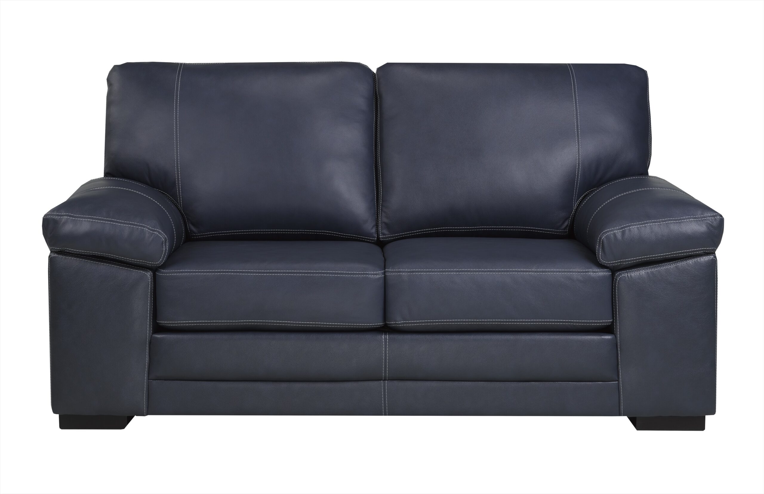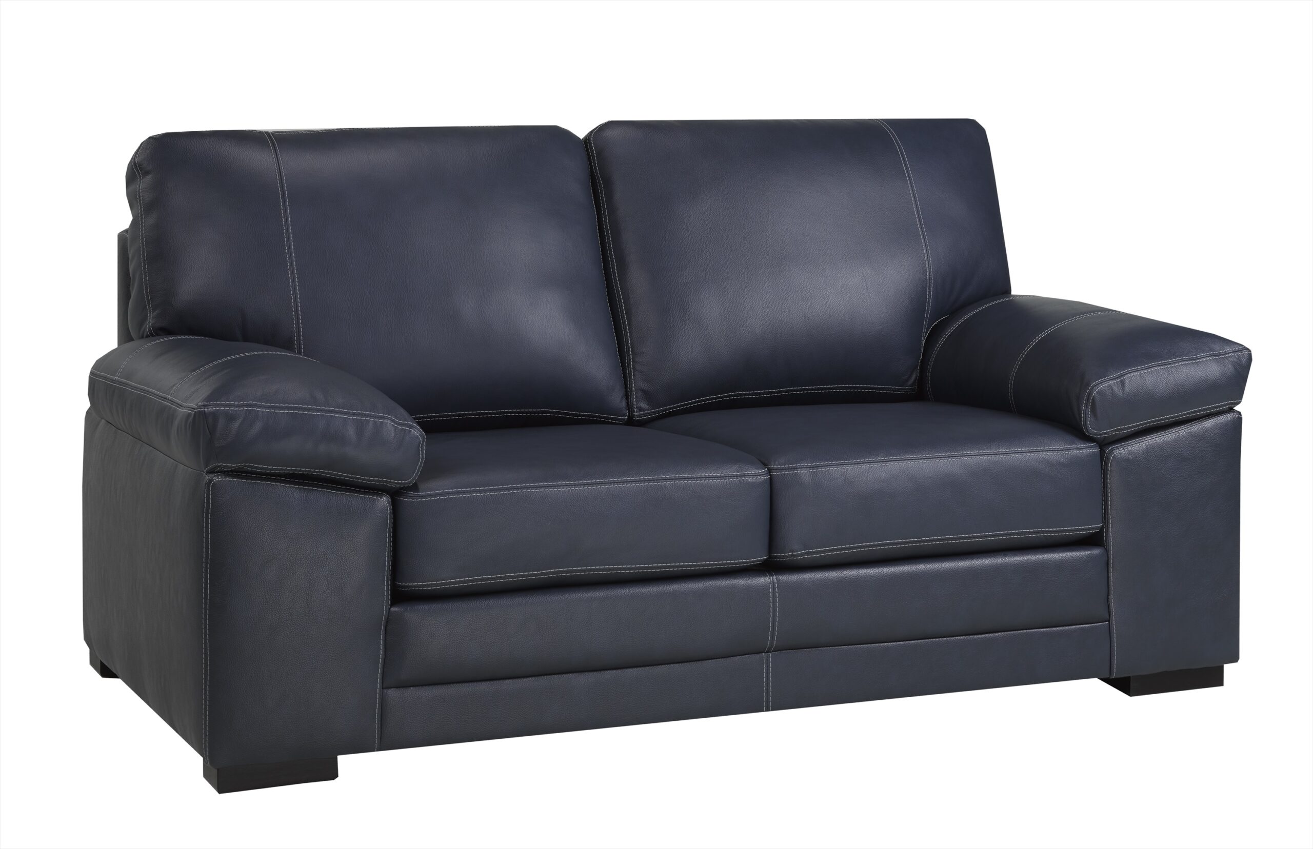 This leather match living room features a contemporary look with padded arms and white contrast stitching. Perfect for any contemporary home, a soft, navy coloured leather covers the entire seating area and arm tops.